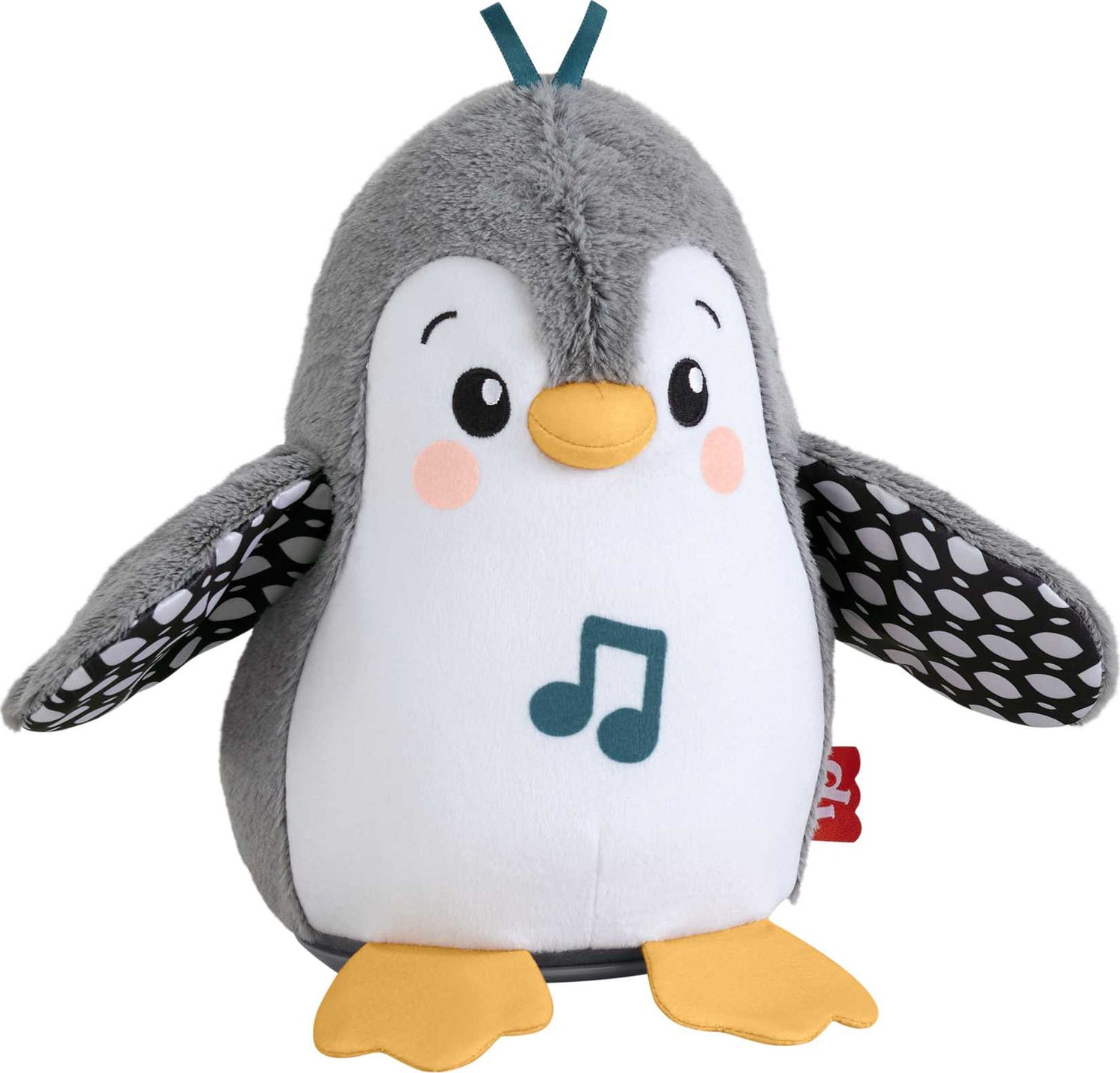 - Plush penguin baby toy responds to your baby’s touch with music and wing-flapping action