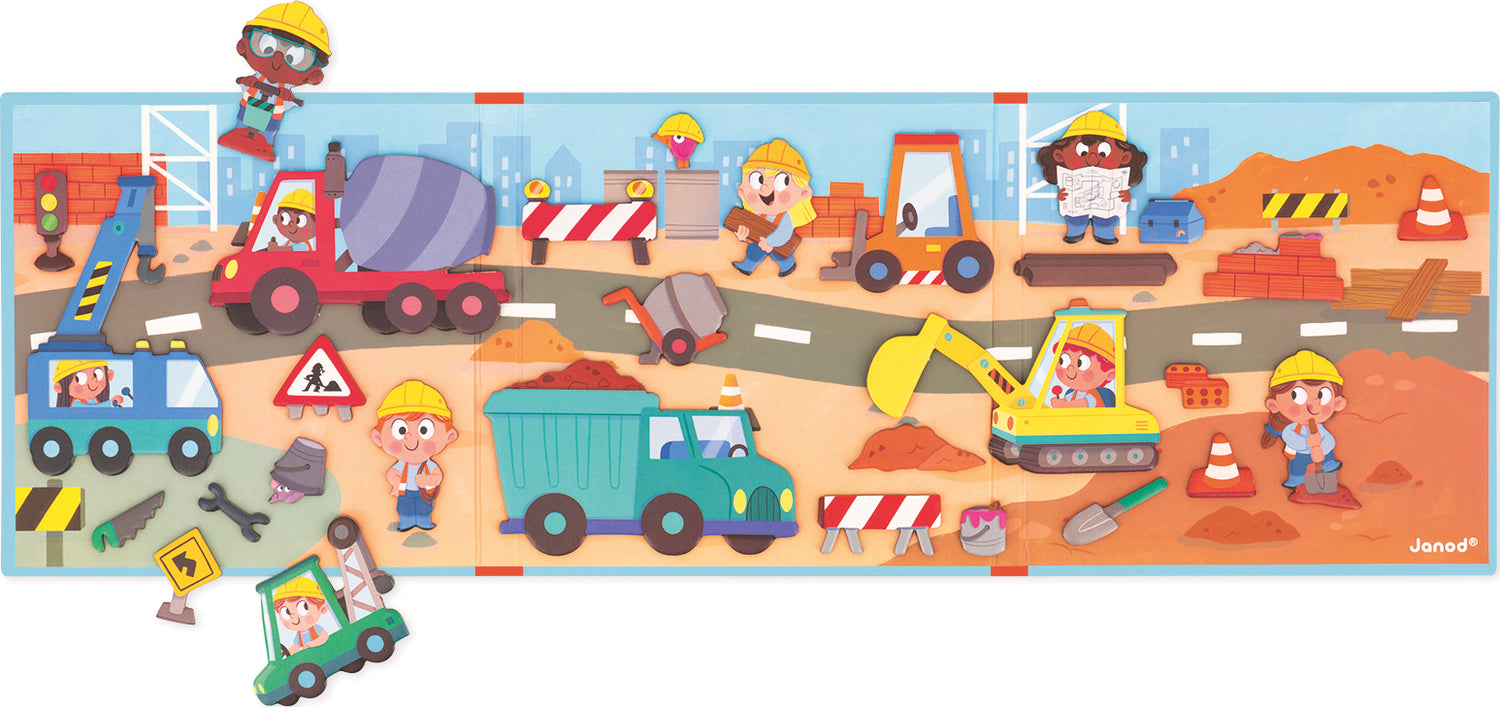 Open this book to delve into a big construction site! Watch out! Hot load coming through! The cement mixer is on the move and the jackhammer isn't far behind. Luckily, the architect is there to help organize the chaos! With the magnetic backdrop and 30 magnets, your child will be able to bring both the characters and vehicles to life to ensure that progress is being made on this building site. Magnetic toy made from FSCTM cardboard. Toy for children aged 3 and up.