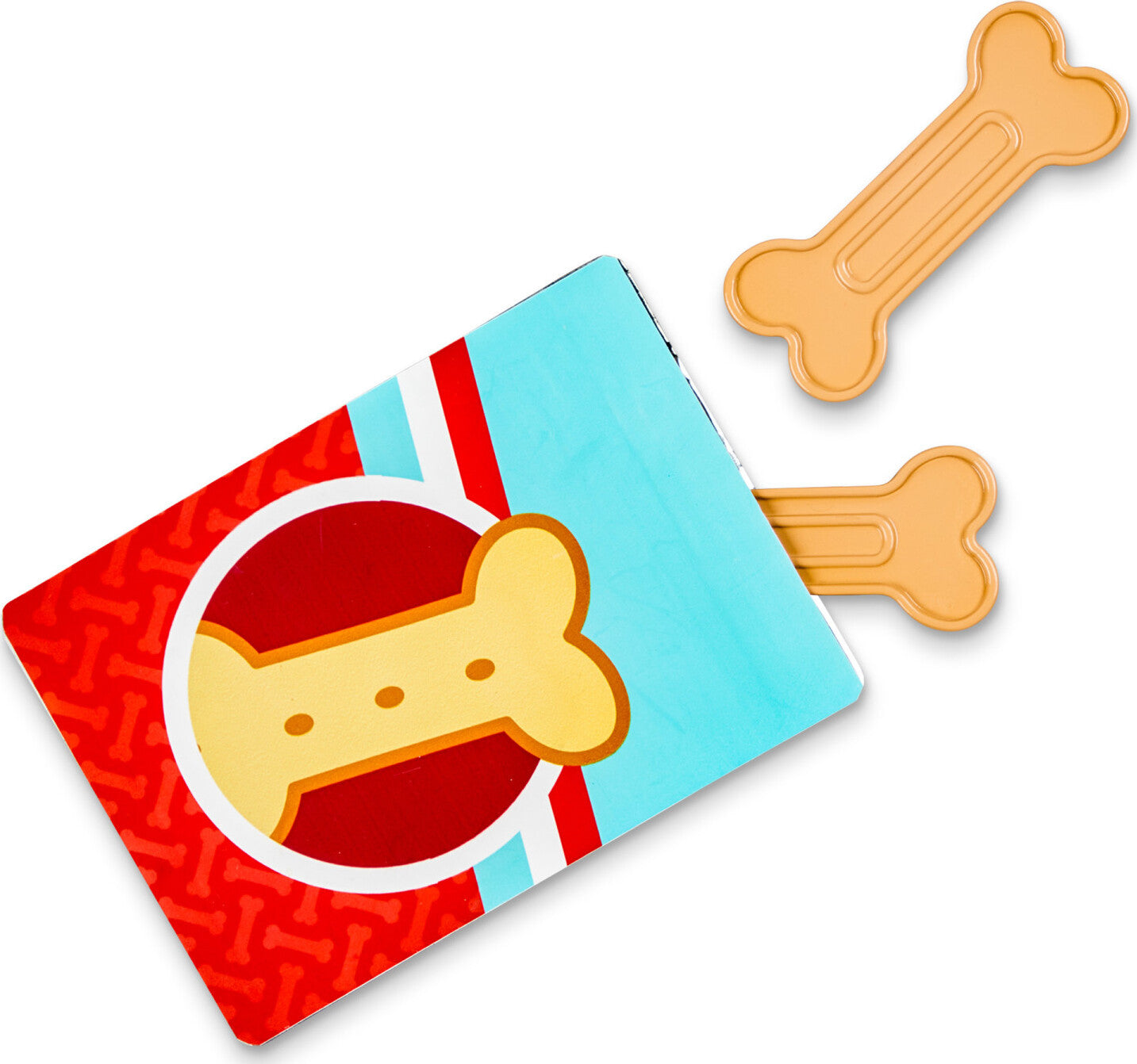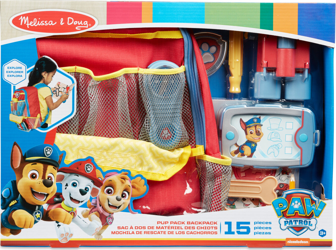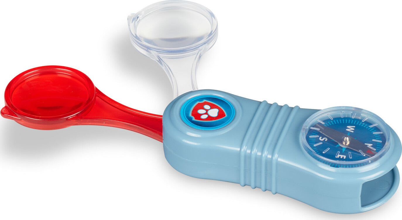 Sturdy-kid-sized backpack with tools and accessories to save the day. Working whistle with clip, adjustable binoculars, 3-in-1 tool with magnifier, red lens, and compass. 4 double-sided mission cards slide into a pup pad; fold-out mission map and activity guide. Write-on badge and pretend dog biscuit treats in storage pouch.
