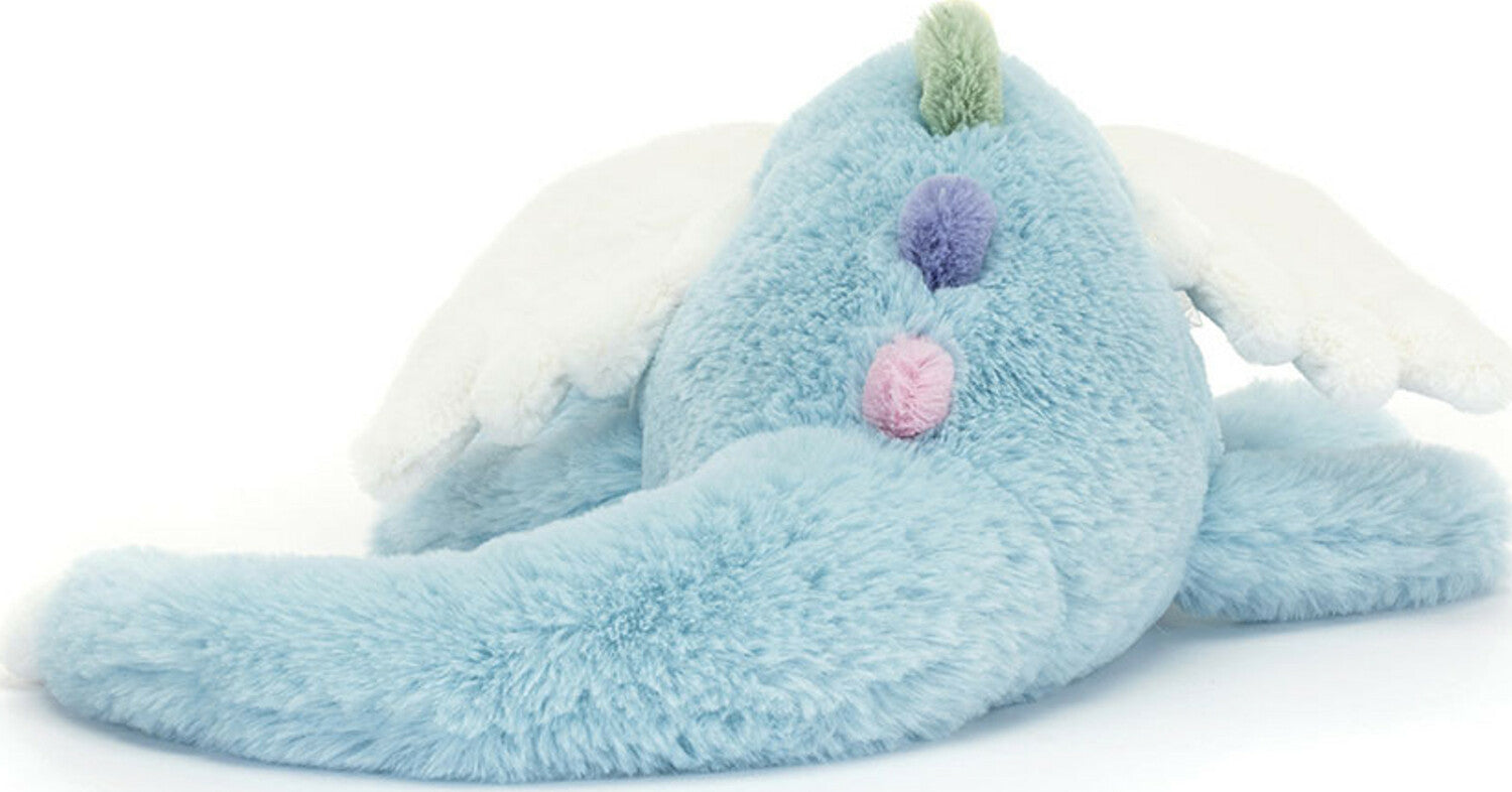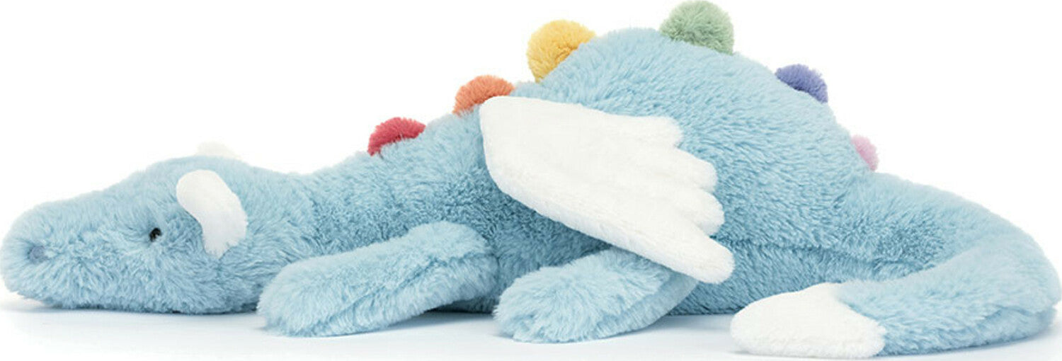 Prepare to be dazzled as Sky Dragon comes in to land! This magical friend has a long sky-blue body and soft rainbow spines from back to tail! With a cuddly snout, bobble nostrils and cloud-white wings, ears and tail dart, this sleepy dragon is an absolute dream.