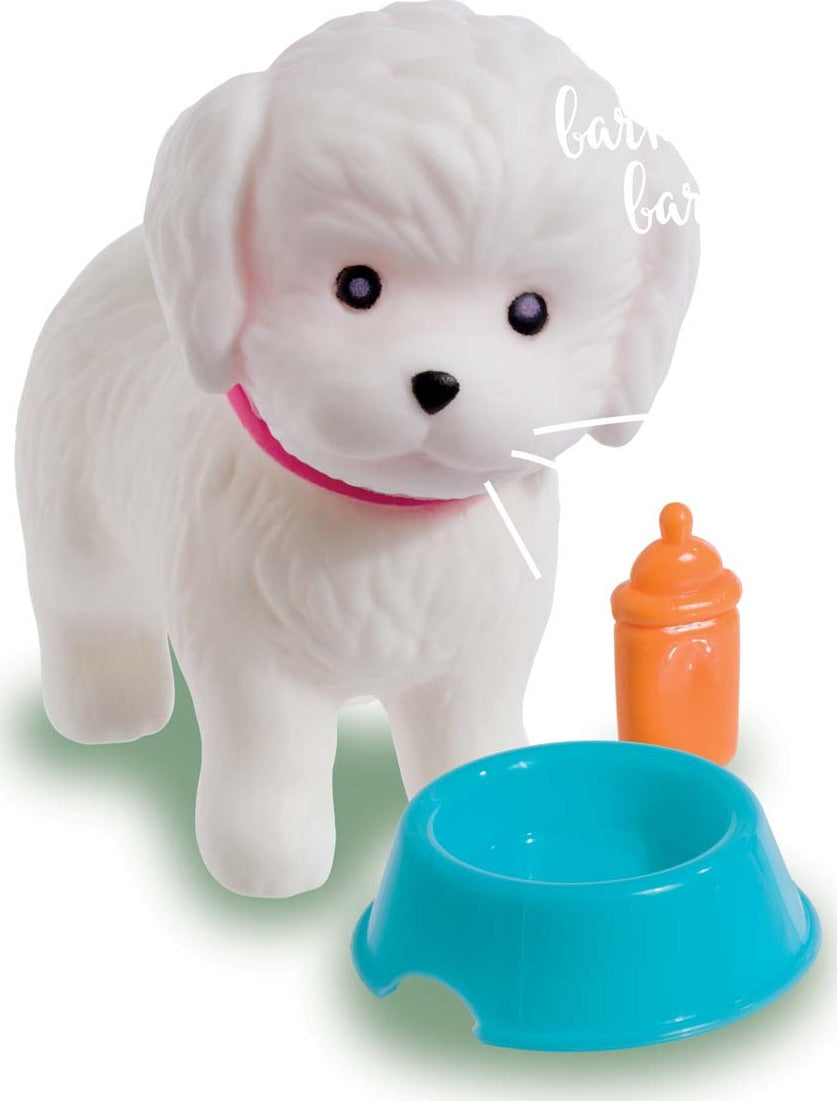 Bitty Buddies come in 4 animal styles including a rabbit, kitten, hamster, or puppy dog. Each tiny animal figurine is made with nontoxic, high-quality plastic. The dog and cat also wear colored collars. Each Bitty Buddies toy comes with its own brightly colored plastic carrying case and care accessories. Each case has a tiny handle and a white door that swings open. Carrying cases are blue, pink, or orange. Included accessories vary, but may include a small pink bowl, as well as either a bottle or bone. Get an assortment of 12 with a colorful display case.