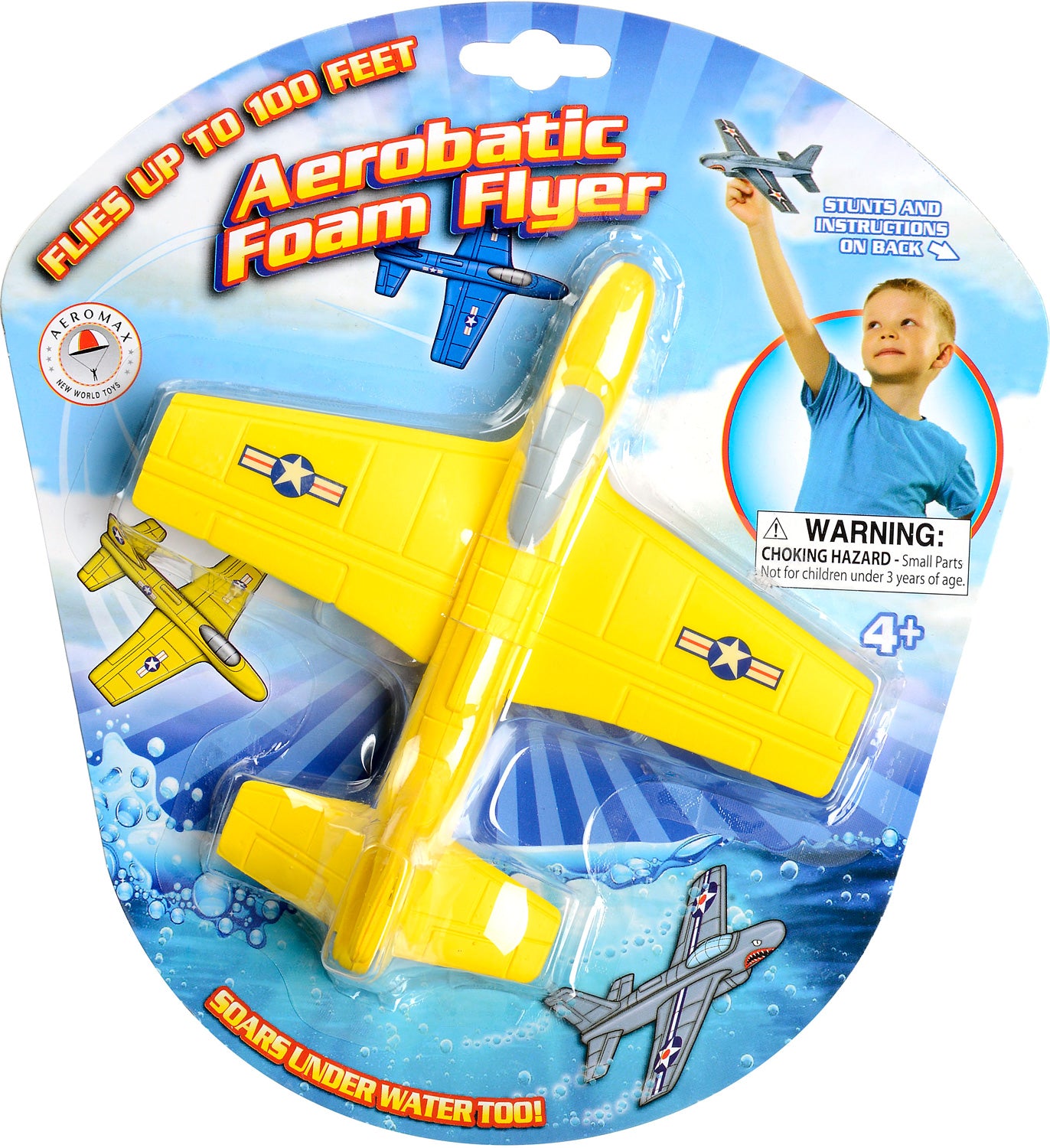 Soaring to New Heights! Aerobatic Foam Flyer flies up to 100 feet. Just grip, toss into the air and release. It’s easy to do stunts like dives and loops or toss it to a friend, for hours of foam flying fun. Works great under water too! Includes 4 Yellow Planes, 4 Blue Planes & 4 Shark Bite editions. For ages 4+.