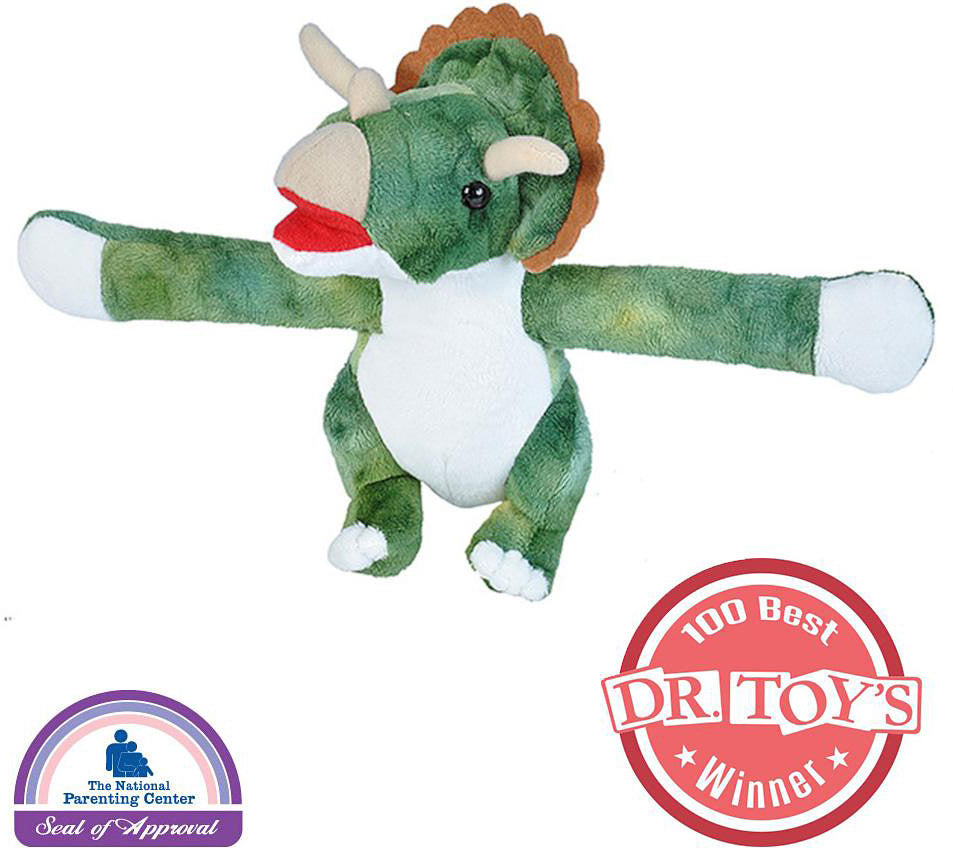 This triceratops stuffed animal is perfectly huggable. Spread the arms wide open. Give the chest a squeeze, then SNAP . . . the arms instantly wrap around and give you a hug. Hugs onto your wrist, backpack, stroller and so much more.