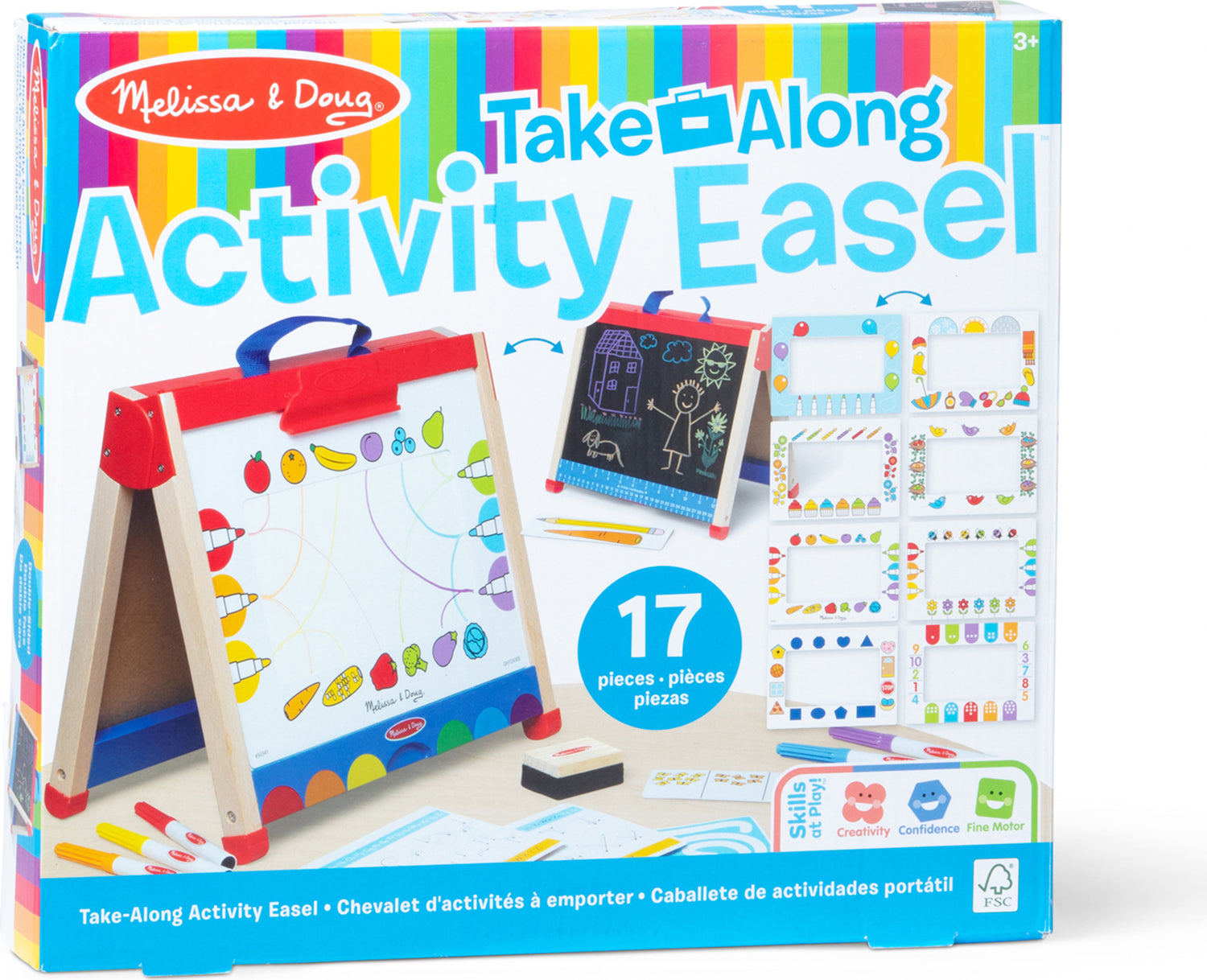 Take creative play on the go anytime with the Melissa & Doug Take-Along Activity Easel! This sturdy wooden tabletop easel is double-sided, with a chalkboard on one side and a dry-erase board on the other. Use the six included liquid chalk markers in a rainbow of colors on both surfaces, and the felt eraser so kids can draw again and again! Four double-sided activity borders and five double-sided tracing cards clip on to the easel and are great for matching, counting, practicing letters and numbers, and measuring with the built-in ruler. Rubber grippy feet keep the easel steady on any surface, and a child-safe integrated locking device is easy for kids to open but stays tightly closed, keeping all the accessories in one place--stored conveniently inside! The activity arts and crafts easel is a great way for kids three and older to tap into their creativity, develop fine motor skills, and boost cognitive skills like numbers, letters, matching, and sorting. The double-sided easel encourages co-play and cooperation, and helps creativity and imagination flourish!