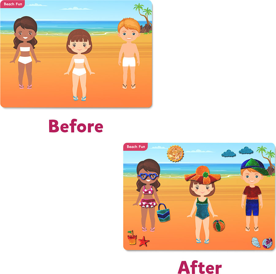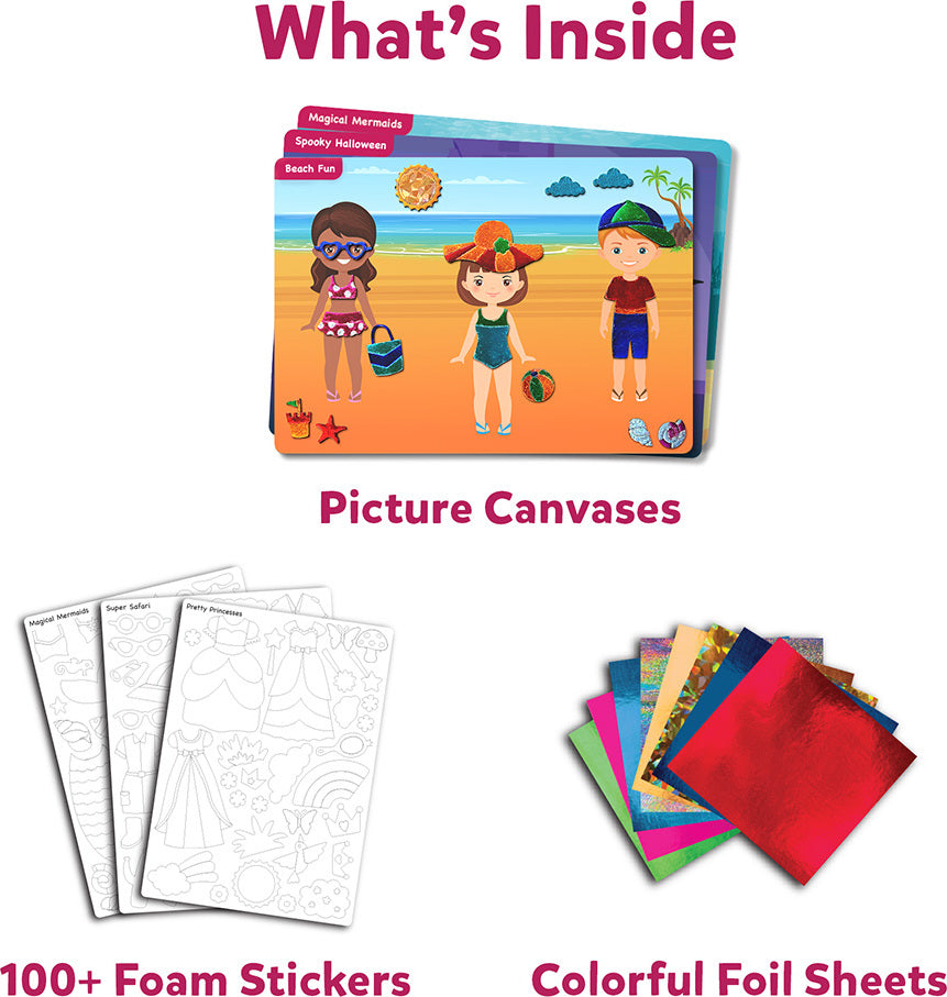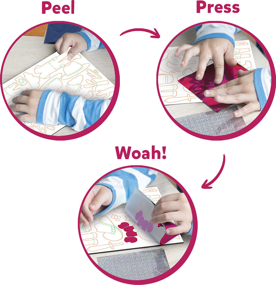 • Select a picture, choose a foam sticker and peel off the top, then press a foil sheet on top of the sticker, and peel it away to reveal the magic!