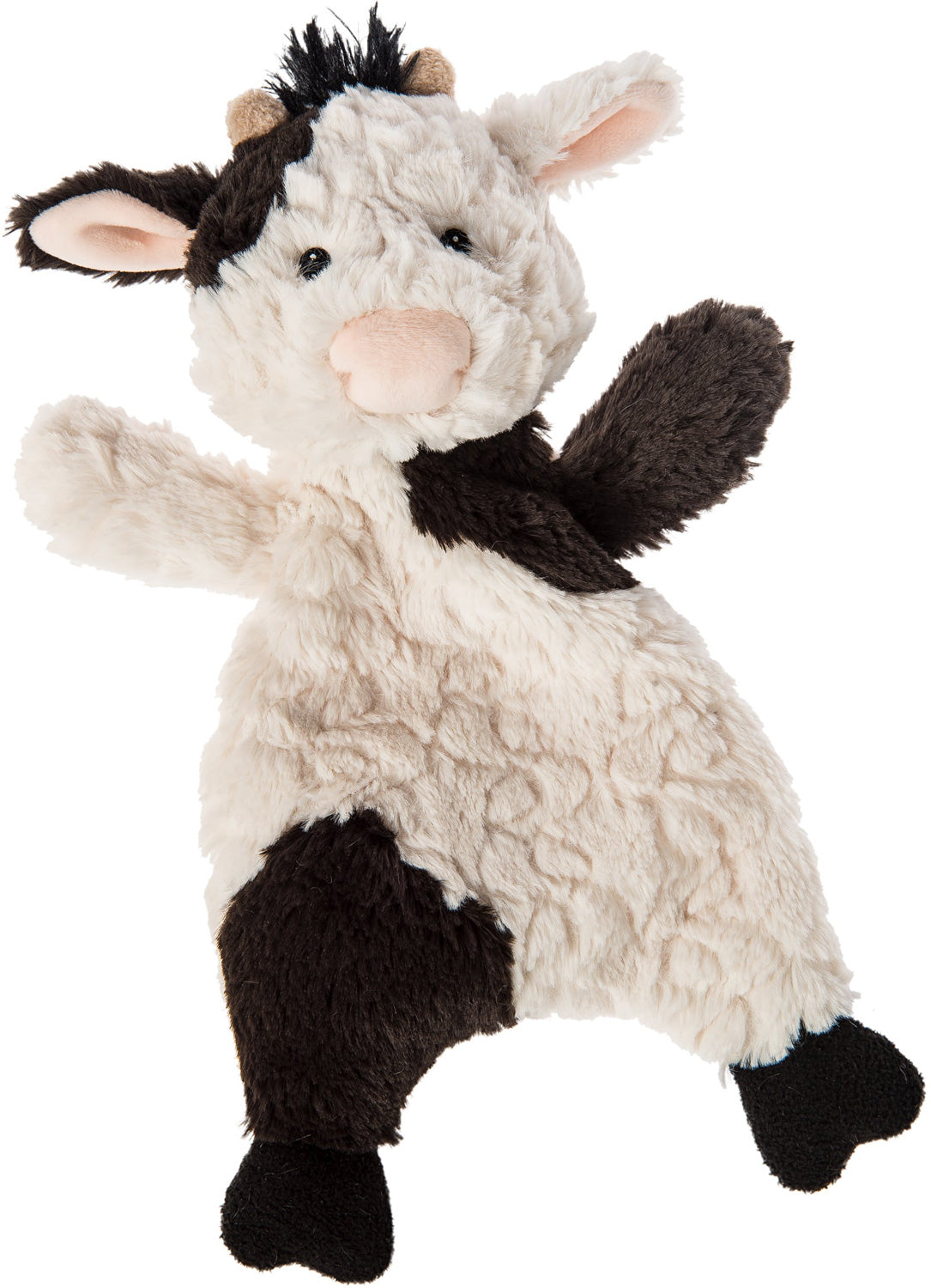 11" Putty Nursery Cow Lovey features an under-stuffed body with a bean bag inside for weight. Lovey is easy for baby to hold. Cute character face and textures keeps baby engaged. Simple, understated design. Soft, etched fabric is super luxe and luscious. Embroidered eyes. Labeled machine wash, air dry.