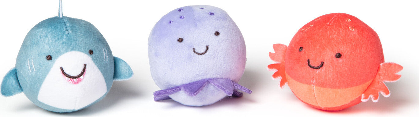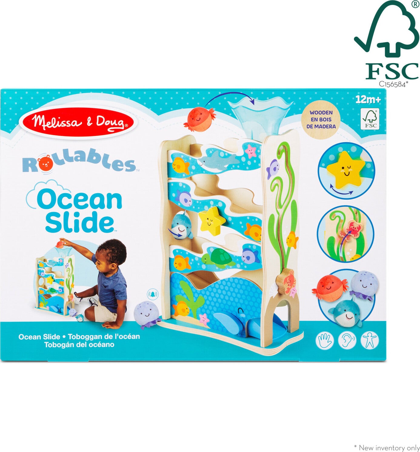 Get playtime and developmental skills rolling with Rollables—adorably round characters that are firm enough to roll but soft enough to squeeze! Inspire imaginative oceanside adventures through kinetic play with this sturdy wooden ramp tower and three Rollables: the friendly crab, silly shark, and awesome octopus with chime. Compatible with other Rollables play sets. Drop Rollables into the removable funnel and watch them tumble down the wavy slide and out the whale's mouth. Turn the sea star and press the whale's flipper to stop and start the action. A built-in bead maze adds to the excitement and tactile experience for kids. The Rollables Ocean Slide is an engaging way to introduce infants and toddlers 12 months and older to cause and effect while encouraging development of important sensory, fine motor, and problem-solving skills. Melissa & Doug infant and toddler toys inspire "a-ha!" moments of discovery. Adorable, diverse characters and a variety of fun shapes and textures encourage exploratory, skill-building play. As part of Melissa & Doug's commitment to helping protect and preserve our planet's natural resources for our children's future