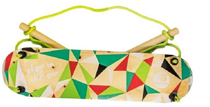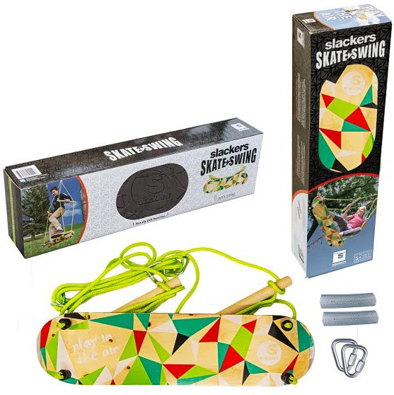 Skate or Swing? Why choose! Our Slackers Skate Swing uses skate board inspiration for the wooden base. Powder coated steel for the adjustable height hand holds. PP adjustable length rope with 2 attachment carabiners. Our base has a non slip foam top with printed graphics on the bottom. Rock back and forth for momentum. If using with the Ninjaline, use the included reinforcement straps to protect your line. Hang from a tree branch or structure for fun for ages 5+